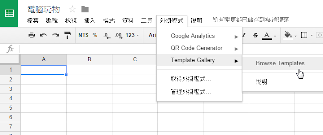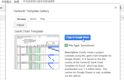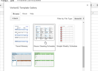 安裝「Vertex42」的外掛後,打開 Google 試算表,可以在上方[外掛程式]選單裡找到,直接開啟範本瀏覽庫。
