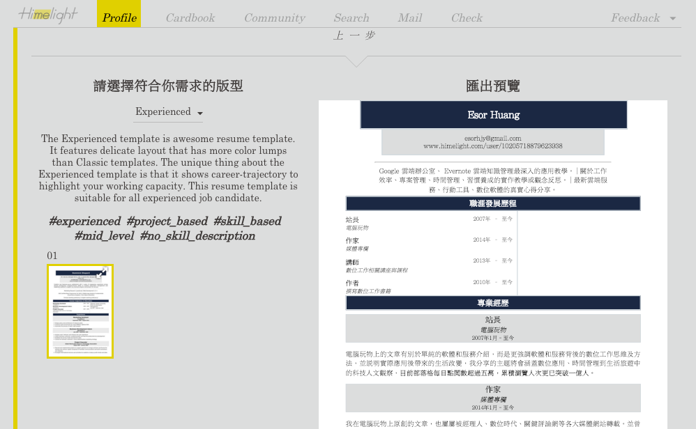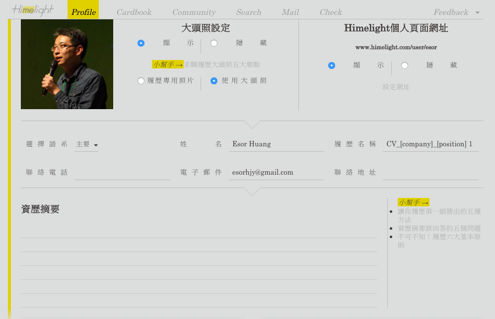 第二個是「 Himelight 」也會在我們填寫履歷資料時做出很多適當的導引,教我們怎麼提供照片?怎麼撰寫經歷?怎麼凸顯出個人的精彩價值?如果是履歷新手或苦手,或許可以在「 Himelight 」的導引中,也能設計出一份不錯的履歷表。