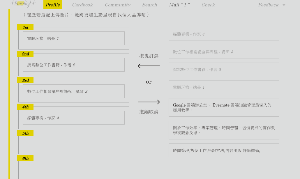 而且「 Himelight 」提供了簡單的線上排版功能,讓我們可以自由調整線上履歷表的版面順序。