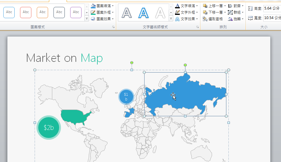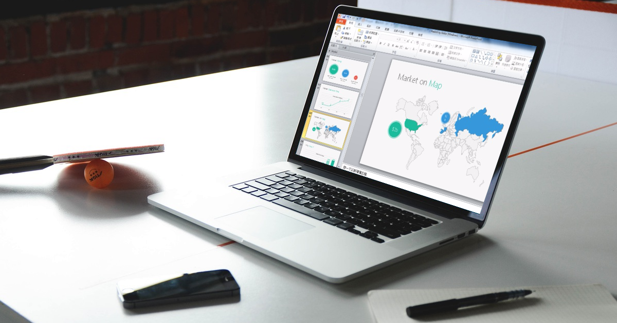而且 Slidor 的「peetch」從設計上就考量了自訂性的需求,例如我們可以一次替換整份簡報的統一配色,或是可以在市場分析地圖中自由的幫任何國家填色。