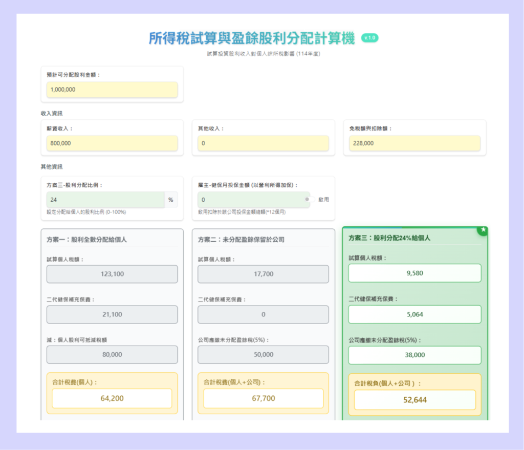 若選擇方案三:股利分配24%,整體稅費負擔為 52,644 元。👉相對最省