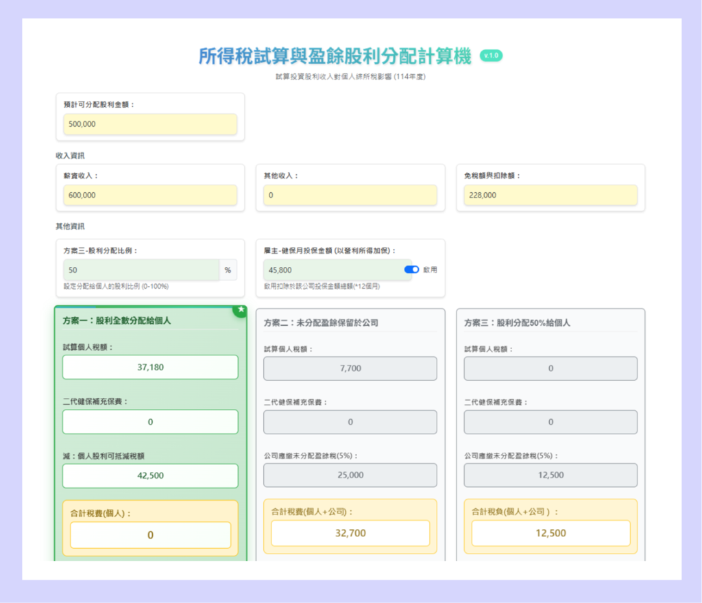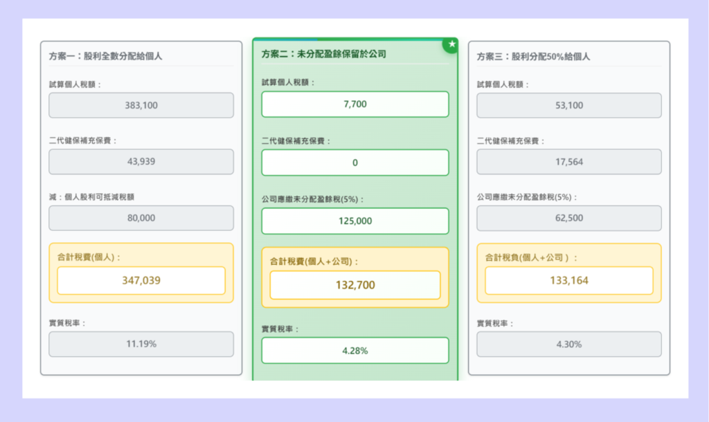 若選擇方案三:股利分配 50%,整體稅費負擔為 141,975 元 。👉相對最省
