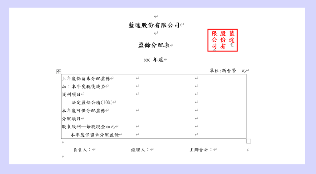 - 董事或董事會擬定分配案:公司每屆會計年度終了,應將營業報告書、財務報表及盈餘分派或虧損撥補之議案,提請股東同意或股東常會承認。盈餘分配表會包含預計要發放多少現金股利、股票股利,或是保留盈餘。